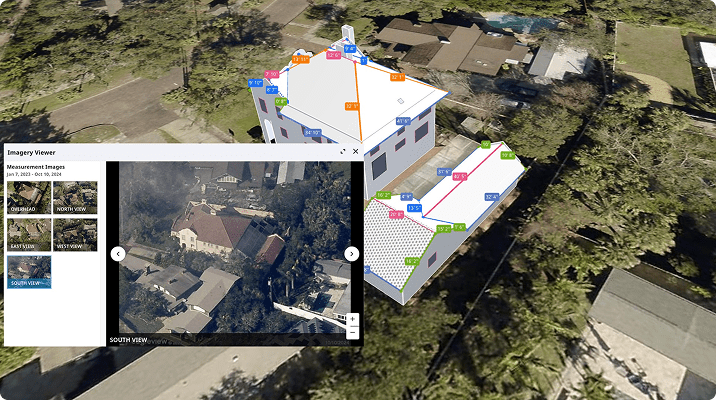 Eagleview One™ delivers a complete interactive 3D model of the property exterior—roof, walls, windows, and doors—plus roof penetrations. Submit an order for any address and explore the full property online with our dynamic 3D visualization tool, complete with historical oblique imagery.